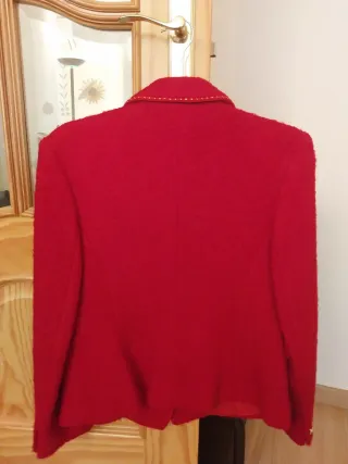 Elegante traje de chaqueta de tweed en color rojo. Destaca por sus detalles dorados. Es talla 44, pero da poca talla. Se ouede vender por separado - Diseño de doble botonadura con botones dorados. - Cuello solapa con pespunte dorado. - Bolsillos frontales con solapa y pespunte dorado. - Tejido texturizado de tweed.