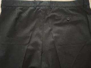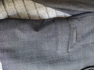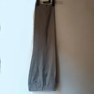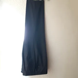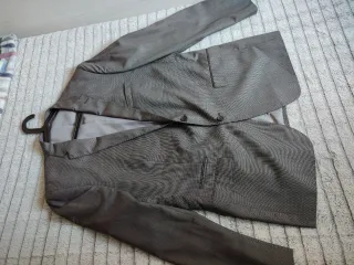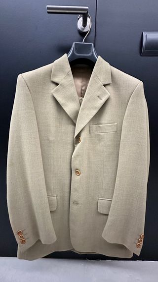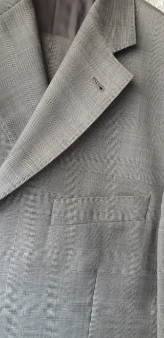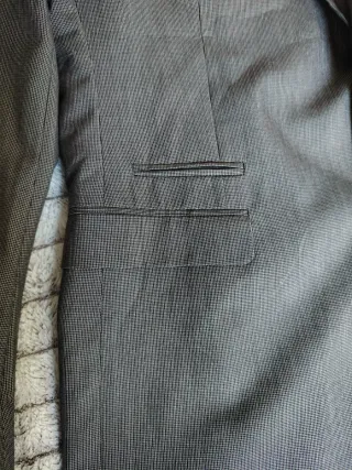Elegante traje de chaqueta con un diseño clásico. - Chaqueta con solapas. - Bolsillos frontales. - Forro interior. - Bordes pantalón cosidos (un borde algo descosido). - Falta in botón en el pantalón y otro en la americana.