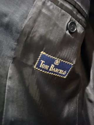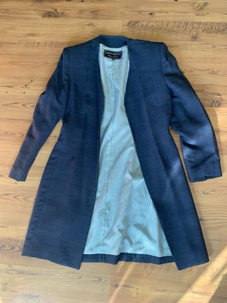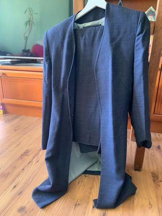 Elegante traje de chaqueta larga. - Chaqueta de corte moderno. - Diseño de raya diplomática en el forro. - Algo descosido en alguna zona.