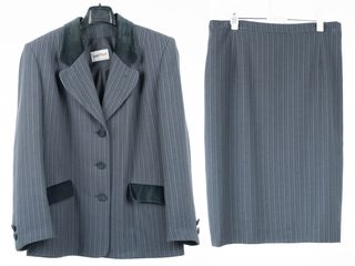 Elegante conjunto de chaqueta y falda de la marca Leid Fort. Color Gris. - Chaqueta con cuello de terciopelo. Diseño a rayas finas. Detalles en los bolsillos de la chaqueta. Talla 52. medidas: chaqueta: hombro-hombro 43 cm, axila-axila 51 cm, largo 71 cm, brazo 62 cm falda: cintura 45 cm, largo 69 cm