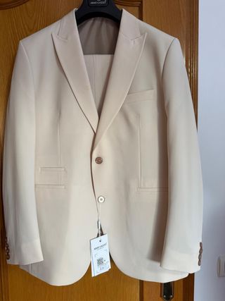 Elegante traje de dos piezas en tono beige, ideal para eventos especiales. - Chaqueta con solapa de muesca. - Cierre de dos botones. - Bolsillo de ribete en el pecho. - Puños con botones. - Chaleco incluido.