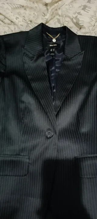Elegante traje de chaqueta y falda. - Diseño de rayas finas. - Cadena decorativa en la chaqueta. - Fabricado en Vietnam. - talla 38, pero también vale para una 36. Prácticamente nuevo usada una sola vez. Es muy elegante