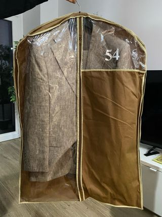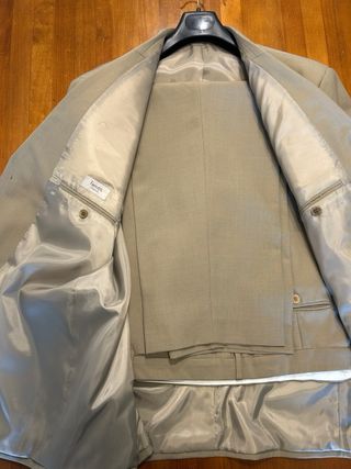Traje de hombre en tonos beige y marrón, perfecto para cualquier ocasión formal. - Chaqueta con cierre de botones. - Pantalón a juego. - Diseño clásico y elegante.