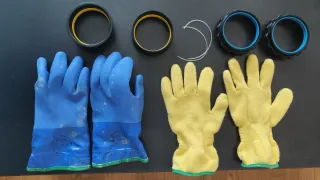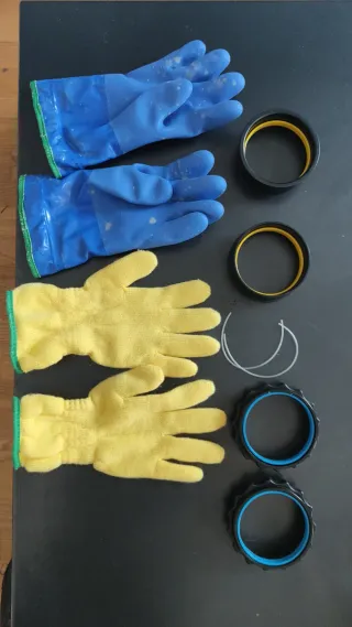 Par de guantes secos diseñados para usarse con un traje seco. Son de color azul y amarillo. Tienen manchas de humedad que no afectan a su uso. - Guantes para traje seco. - Color azul y amarillo.
