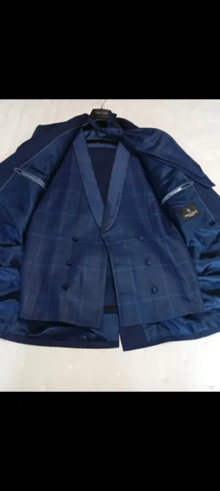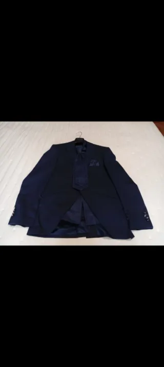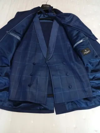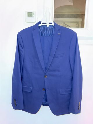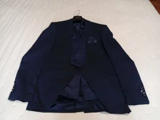 Traje de boda de color azul oscuro. - Chaqueta con solapas. - Bolsillos frontales con solapa. - Cierre de botón. Utilizado en dos ocasiones