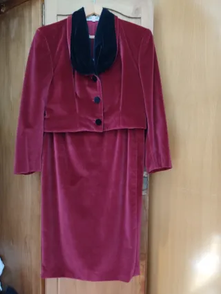Elegante traje de dos piezas, ideal para ocasiones especiales. Compuesto por una chaqueta y un vestido. - Chaqueta con solapa de terciopelo negro. - Cierre de botones. - Vestido de corte recto.