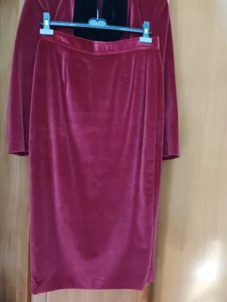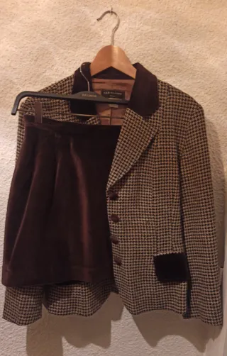 Precioso y elegante chaqueta y falda de terciopelo marrón chocolate de ZARA, con un diseño clásico. - Tejido principal para de gallo. - Detalles en terciopelo: tapetas bolsillos, cuello y botones forrados. - Bolsillos delanteros con solapa de terciopelo. - Chaqueta y falda con forro interior. - COMPOSICIÓN chaqueta: 55% lana, 18% mohair, 18% seda - COMPOSICIÓN falda: 73% algodón, 27% modal. - TALLA Chaqueta: T42 - TALLA Falda: T40 - MEDIDAS en las fotos ⚠️ NO SE VENDE POR SEPARADO