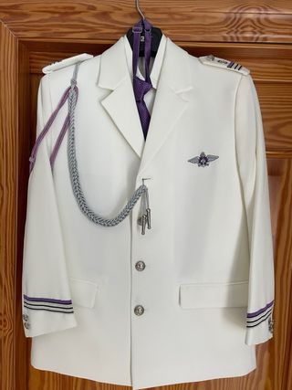 Traje de comunión, conjunto completo más zapatos - Chaqueta azul marino con detalles blancos en puños y cuello. - Pantalón a juego. - Incluye cordón decorativo plateado y blanco. - Insignia de aviación en la solapa. traje de comunión, conjunto completo más zapatos