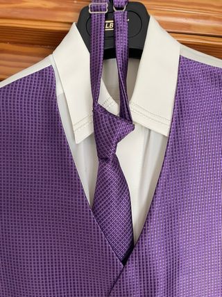 Conjunto de traje de novio que incluye chaqueta, chaleco, camisa, tirantes,corbata y pantalón. - Chaleco con estampado floral. - Corbatón gris oscuro. - Tirantes blancos con patrón de rombos. Tallas(fotos adjuntadas) -Chaqueta 52 -Pantalón 52 -Chaleco 52 -Camisa 41 -Zapatos 43