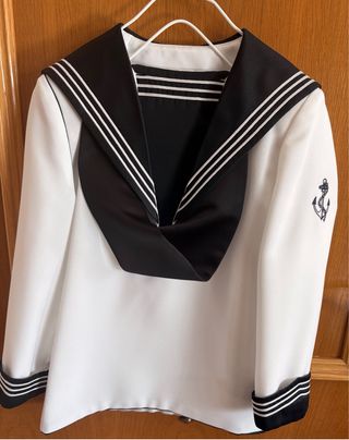 Traje de comunión estilo marinero clásico. - Talla 8. Una sola puesta - Tejido de calidad - Cuello de pico con detalles de rayas. - Lazo decorativo en el cuello. - Insignia de ancla bordada en la manga. - Puños y cuello con ribete de rayas. - Silbato de metal - Comprado en Gisela