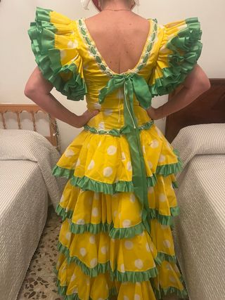 Precioso traje de flamenca, ideal para cualquier evento. Es un diseño alegre y vistoso. - Falda de vuelo y mangas vistosas - Cuerpo con lunares blancos sobre fondo amarillo. - Volantes en color verde.