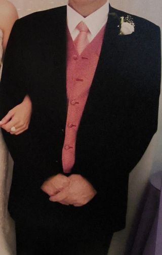 Traje negro con chaleco rojo clarito