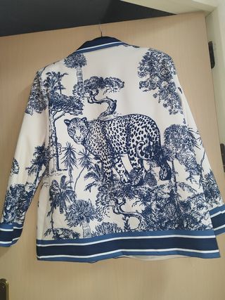 Talla única da hasta la 44 Americana con un llamativo estampado de inspiración selvática y felina. El diseño combina tonos azules sobre fondo blanco, creando un contraste elegante. - Cuello con detalle de rayas. - Puños y bajo con banda decorativa. - Bolsillos frontales.