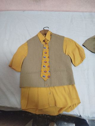 Conjunto de ropa para niño de 7 a 9 años que incluye camisa, chaleco y corbata - Camisa de manga corta. - Chaleco de vestir. - Corbata con estampado.No hago envios.