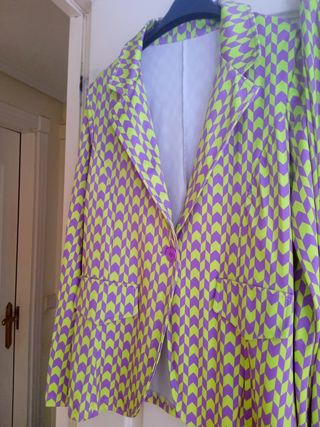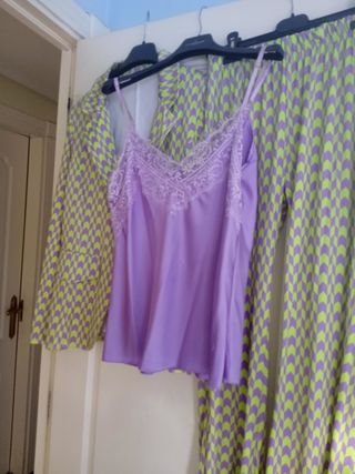 Precioso traje ..muy favorecedor. Pantalón con goma en cintura..muy cómodo y de pata un poco acampanada .. La chaqueta no es forrada ..y tiene elástico. Son tonos verdes y lilas ..y de tejido super suave.. Regalo lencera lila ..que le va de miedo . Puedes ver opiniones Muchas gracias por todo 😘