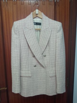 Elegante blazer de tweed en color rosa de Zara. Ideal para cualquier ocasión. - Diseño de doble botonadura. - Corte clásico. - Tejido suave y de buena calidad.