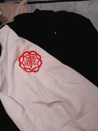 Túnica de la hermandad del Cristo de la Agonía de Cieza. Prenda con un diseño distintivo. - Detalle bordado en rojo con las iniciales IHS. - Combinación de colores blanco y negro.