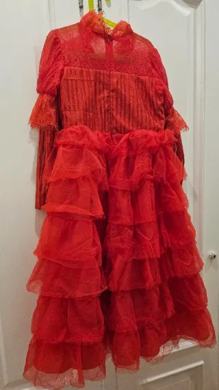 Disfraz inspirado en Lydia Deetz de la película Beetleljuice. Este atuendo es de color rojo y cuenta con un diseño detallado. - Parte superior con encaje y detalles acanalados. - Mangas largas con volantes de encaje. - Falda con múltiples capas de tul. - Cuello alto. - Talla 150 cm. - Usado una sola vez.