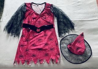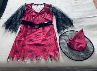 Disfraz de bruja para adulto con un diseño llamativo. - Mangas de encaje negro. - Cinturón negro con detalle de araña. - Falda con estampado de telarañas. - Incluye sombrero a juego.