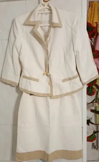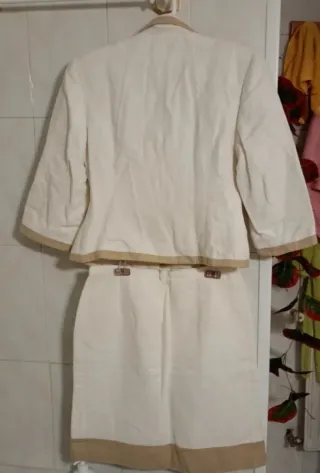 Conjunto de chaqueta y falda de la marca TRUCCO. - Chaqueta con cuello solapa y cierre de botones. - Mangas tres cuartos. - Bolsillos frontales con detalle. - Falda a juego con detalle en el bajo. Tiene evidente desgaste de uso amarillo en el cuello interno de la chaqueta que con algún producto fuerte de limpieza puede resolverse.