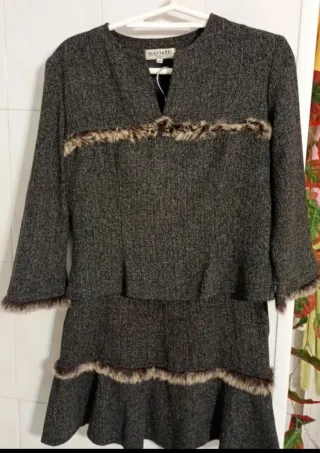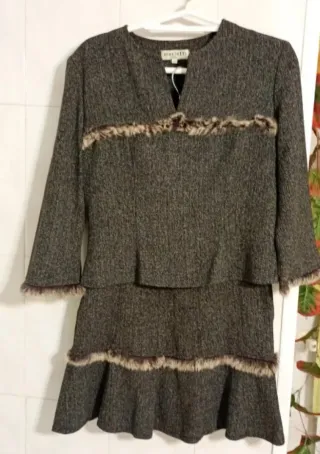 Elegante conjunto de chaqueta y falda de la marca Merletti. El tejido tiene un acabado tweed con detalles de pelo sintético. - Chaqueta con cuello en V y manga 3/4 y cremallera lateral. - Falda con vuelo y detalle de pelo con cremallera lateral. - Combinación de tonos marrones y beige.
