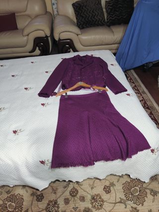 Traje de verano, color malva, de chaqueta manga corta y falda. Talla 42/44 Medidas: chaqueta largo 70cm, hombro 41cm, sisa 50 cm. Falda, cintura 40 cm, cadera 50 cm, largo 57 cm.
