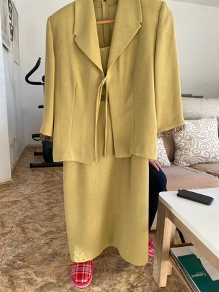 Conjunto compuesto por vestido corto y chaqueta a juego. Da un look sofisticado y elegante. La tela tiene una textura brillante. No necesita plancha. Está impecable.