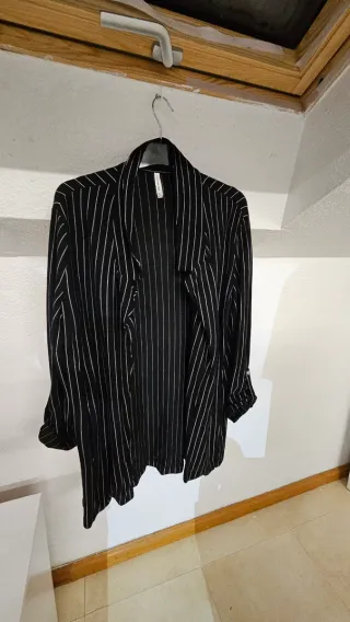 Blazer elegante con un diseño de rayas verticales blancas sobre fondo negro. Las mangas cuentan con detalle de botones. - Diseño de rayas verticales. - Botones en las mangas.