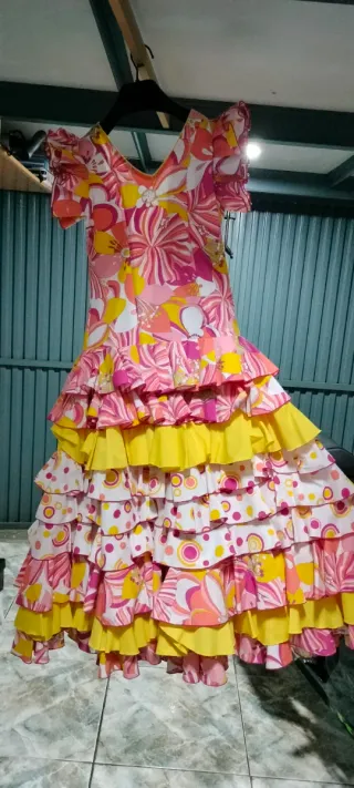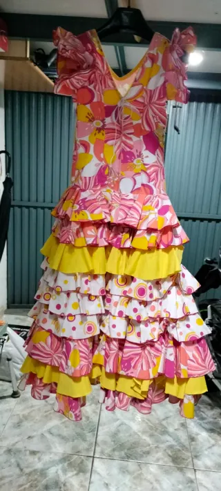Traje de flamenca en buen estado, con un bonito color rosa. - Diseño con volantes en la falda. - Mangas acampanadas con volantes. - Tejido con canalé vertical. Para arreglar en cierre que está descosido y volver a usar.