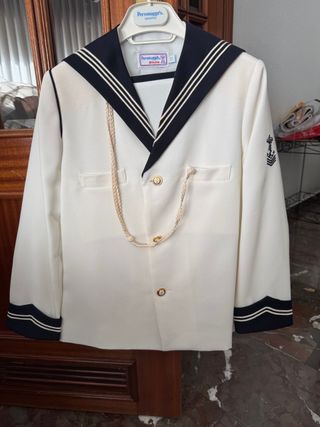 Traje de comunión de estilo marinero. Talla 10. - Chaqueta blanca con cuello y puños azul marino. - Detalle de cordón dorado. - Botones dorados. - Insignia de ancla bordada en la manga.