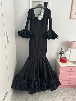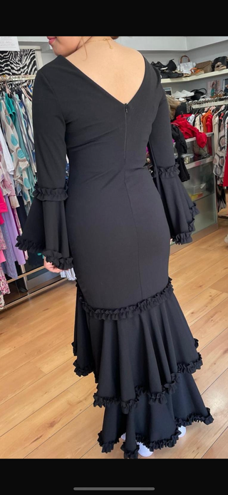Traje de flamenca negro canastero Talla S/M . Confeccionado por modista Usado en dos ocasiones Manga larga con volantes Falda con cancán para más vuelo Escote de pico trasero y delantero
