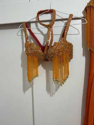 Conjunto de dos piezas para danza del vientre, con un diseño llamativo y adornado. - Top con tirantes y cuello. - Adornos de pedrería y flecos. - Color dorado y naranja.
