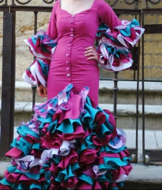 Traje de flamenca en color buganvilla ,talla 40. Ideal para ferias y romerías. - Diseño con volantes en la falda. - Mangas acampanadas con volantes.