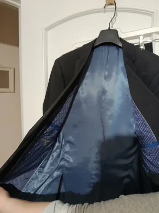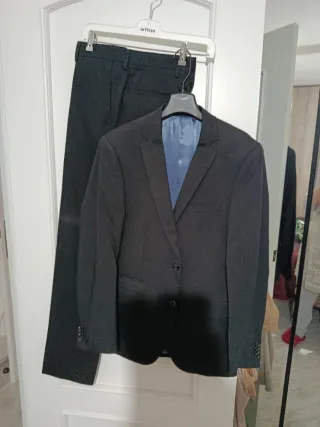 Elegante traje de chaqueta de la marca Zara. - Color azul. - Diseño clásico y versátil. - Cierre de dos botones. - Bolsillos frontales con solapa. - Chaqueta talla 50 y pantalón talla 38 ( Slim fit) Usado una sola vez para una graduación.