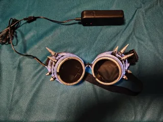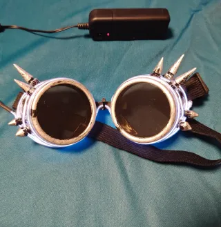Gafas de estilo steampunk con detalles de pinchos y luces LED azules. - Diseño llamativo para disfraces. - Acabado plateado y detalles en azul. - Pilas incluidas