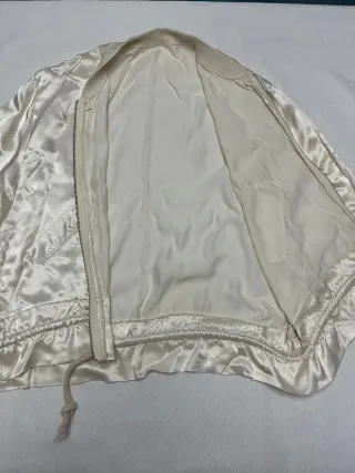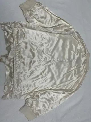 Chaqueta de satén fina con un acabado brillante y elegante. - Cierre de cremallera frontal. - Bolsillos en la parte delantera. - Puños y cintura elásticos. - Cordón ajustable en la cintura. - Media manga con vitones de canale. -Bolsillos ciegos. Se le quitó la etiqueta y no llegó a estrenarse.
