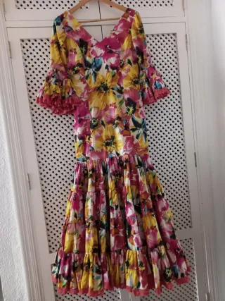 Traje de flamenca de la marca Manuela Macias, talla 38. En la parte trasera tiene el volante canastero un poco descosido. Forro, tela ligeramente elástica, bolsillo debajo del volante. Medida del bajo de cenefa: 84cm. - Tejido principal: 70% algodón, 30% poliéster. - Fabricado en España. - Diseño con estampado floral.