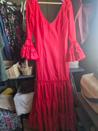 Traje de flamenca de color rojo, con volantes en las mangas y en la falda. Una sola puesta. - Diseño con escote en V. - Mangas largas con volantes. - Falda con varios niveles de volantes.