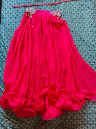 Conjunto de danza oriental de dos piezas y cinturón. - Sujetador con adornos plateados y pedrería. - Cinturón a juego con pedrería. - Falda larga con volantes y adornos plateados. Traje de danza oriental. Está nuevo. Solo puesto uno vez para una actuación. El color es rosa fluorescente tipo como los rotuladores fluorescente de fabell castell. Es una talla S. También, podría conseguir dos más de mis compañeras. En las tallas M y L.