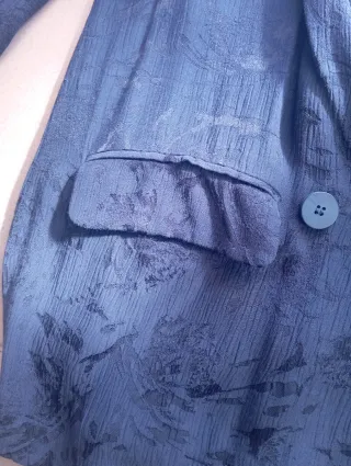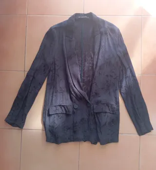 Blazer ligero de tejido jacquard color azul marino con estampado floral negro y textura crepé. Corte clásico con cierre de botones y bolsillos frontales. Marca de Zara mujer. Talla XS. Composición: Tejido exterior 100% viscosa y Forro 100% acetato