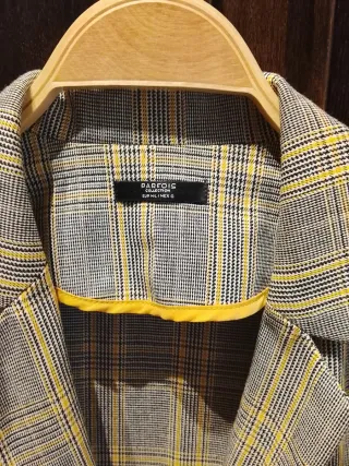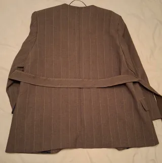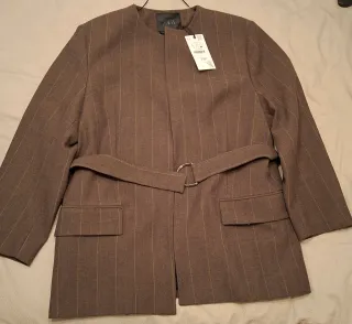 Elegante blazer de Zara con un clásico estampado de raya diplomática. Una prenda versátil para añadir un toque sofisticado a tu vestuario. - Diseño con cuello redondo. - Cinturón a juego con hebilla metálica. - Bolsillos de solapa en la parte delantera.