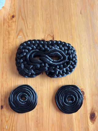 Moño de fallera de la marca HAIR UP. Ideal para complementar tu traje regional. - Moño cosido y pelo para fallera. - Incluye etiqueta con referencia 'Rodetes Fibra Medianos c.2c'. - Dirección: Maria Cristina, 1 - 46001 - Valencia.
