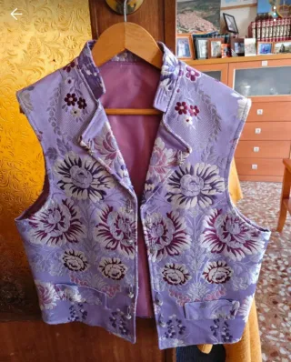 Traje regional valenciano de fallera para niña de 12 años. En muy buen estado. El conjunto esta formado por: Falda morada con flores pistacho, naranja, blanco, etc. La falda se puede alargar hasta talla M. Tres corpiños: -Un corpiño de manga corta con lazo en la espalda del fondo de la tela. -Un corpiño pistacho siglo XVIII con lazo en la espalda. -Un corpiño de coteta manga larga bordado a mano Tres zapatos: -Zapatillas de valenciana forradas de la tela talla 39 -Zapatos forrados de la tela talla 40 -Zapatos forrados de la tela talla 36 Tela extra para forrar zapatos o arreglos
