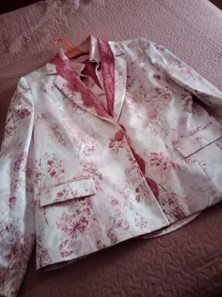 Elegante chaqueta de traje con un bonito estampado floral y encaje en solapa y botones. La americana es talla 52. Camisa de satén en rosa palo,manga larga talla 54. Pantalón color frambuesa,corte recto y ancho desde las caderas. La cintura mide 82 cm de lado a lado para una talla 48-50.