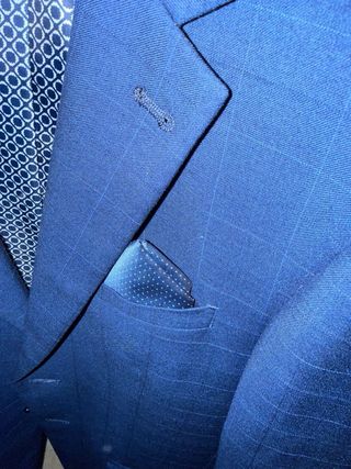 Traje de chaqueta y pantalón en color azul, talla 40. - Chaqueta con forro interior estampado. - Bolsillo en la solapa con pañuelo a juego. - Pantalón a juego con el mismo estampado de cuadros.