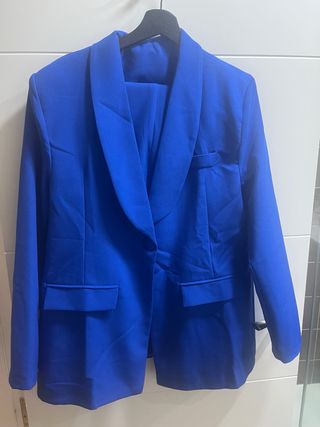 Conjunto de traje de chaqueta y pantalón azul kkein . Pone L pero sirve para una M -adjunto fotos de las medidas) - Chaqueta con solapa ancha. - Pantalón a juego.
