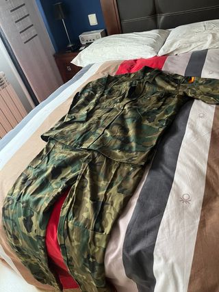 Conjunto de ropa militar con estampado de camuflaje. - Chaqueta con bolsillos frontales. - Pantalón con bolsillos laterales. Talla XL