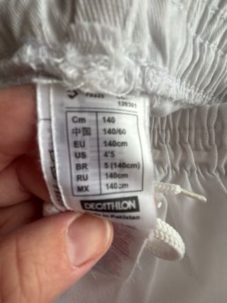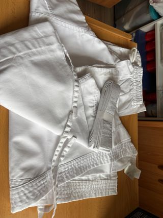 Traje de karate blanco para niños, talla 140, ideal para edades de 8 a 9 años. Incluye cinturón. - Tejido resistente y cómodo. - Cierre con cordones en la chaqueta y pantalón. - Cinturón blanco incluido.