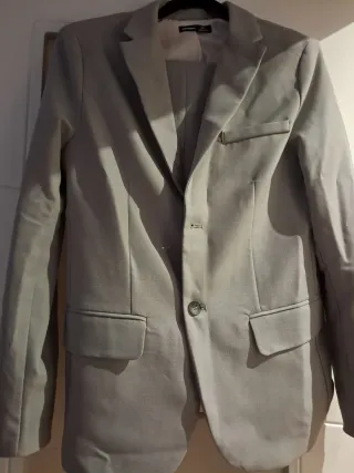 Traje de vestir elegante, casi nuevo y en perfecto estado. Solo se ha usado un par de veces. - Chaqueta con dos botones. - Bolsillos frontales. - Puño con tres botones. - Pantalón tipo slim