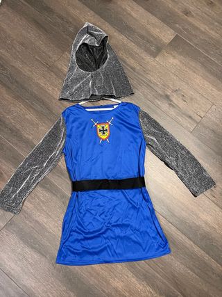 Disfraz de caballero con detalles plateados y cinturón negro. Incluye capucha. - Diseño de escudo con espadas cruzadas en el pecho. - Mangas y capucha con acabado brillante. - Túnica azul.